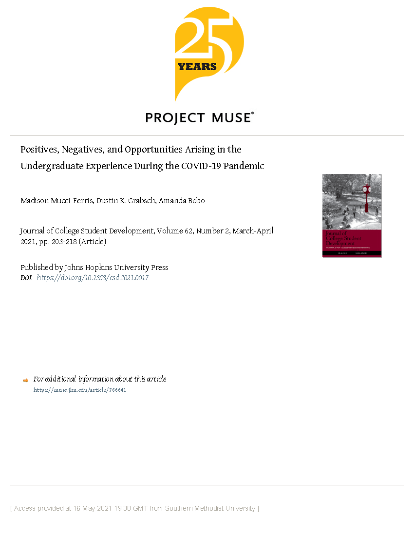 Mucci-Ferris, M., Grabsch, D. K. & Bobo, A. (2021). Positives, negatives, and opportunities arising in the undergraduate college experience due to COVID-19. Journal of College Student Development. 62(2): 203-218. doi: 10.1353/csd.2021.0017