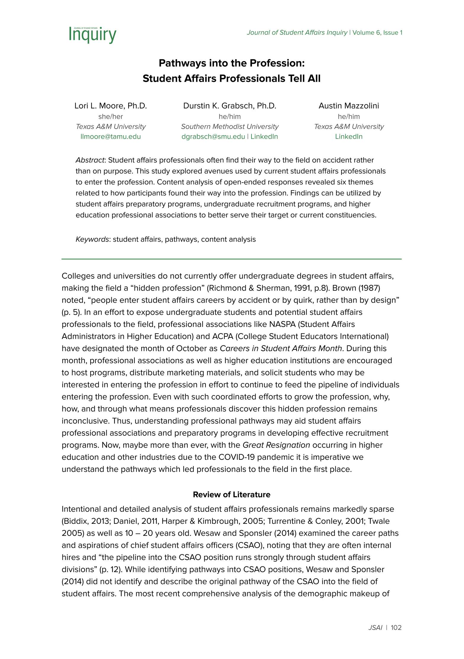 Moore, L. L., Grabsch, D. K., & Mazzolini, A. (2023). Pathways into the profession: Student affairs professionals tell all. Journal of Student Affairs Inquiry. 6(1): 102-113. http://www.studentaffairsassessment.org/jsai-volume-6