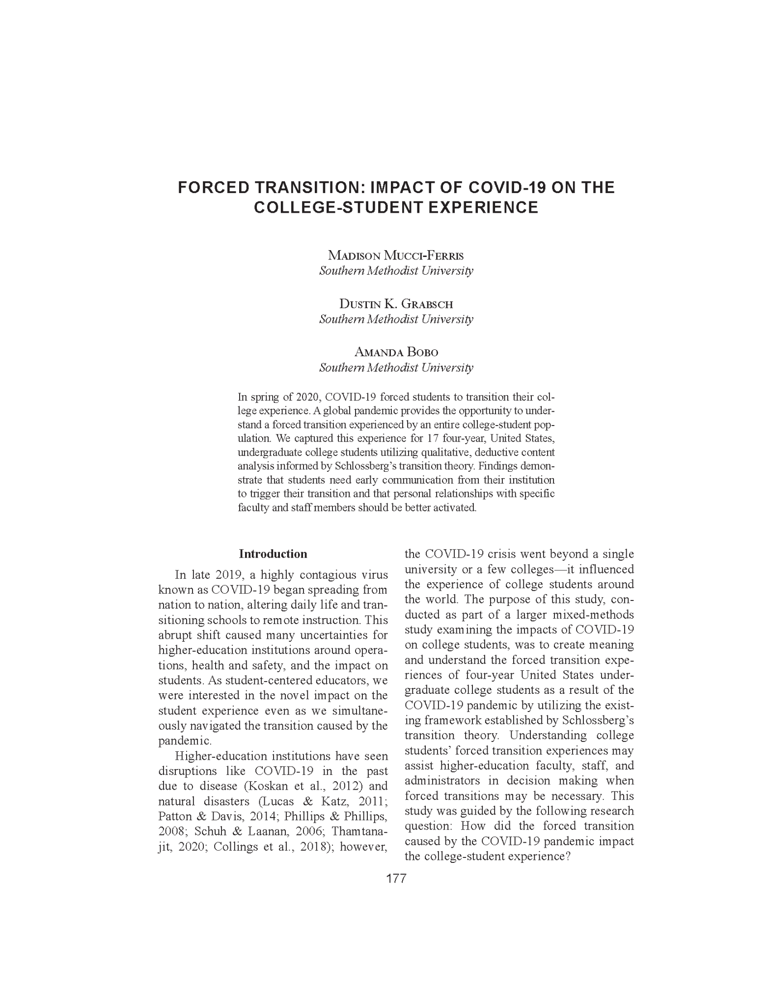 Mucci-Ferris, M., Grabsch, D. K. & Bobo, A. (2023). Forced transition: Impact of COVID-19 on the college student experience. Education. 143(4): 177-191.