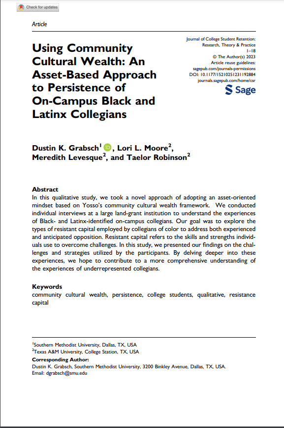 Grabsch, D. K., Moore, L. L., Levesque, M., & Robinson, T. (2023). Using Community Cultural Wealth: An Asset-Based Approach to Persistence of On-Campus Black and Latinx Collegians. Journal of College Student Retention: Research, Theory & Practice, 15(5): 1467-148. https://doi.org/10.1177/15210251231192884