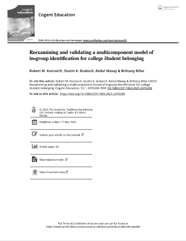 Kunovich, R., Grabsch, D. K., Billar, B., & Wasay, A. (2025). Reexamining and validating a multicomponent model of in-group identification for college student belonging. Cogent Education, 12(1). https://doi.org/10.1080/2331186X.2025.2476268