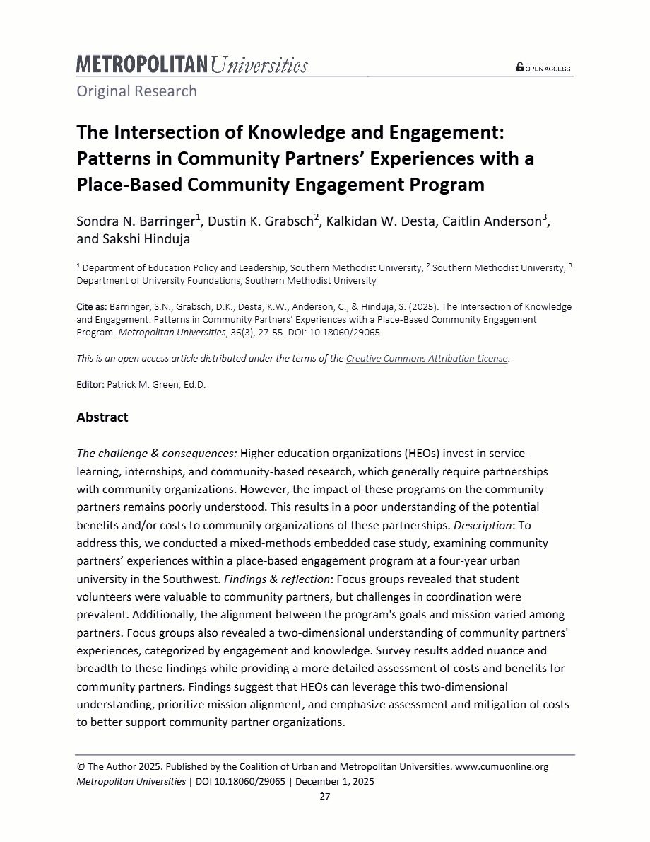 Barringer, S., Grabsch, D. K., Anderson, C., Desta, K. W., & Hinduja, S. (2025). The intersection of knowledge and engagement: Patterns in community partners’ experiences with a place-based community engagement program. Metropolotin Universities Journal, 36(3), 27-55. doi: 10.18060/29065