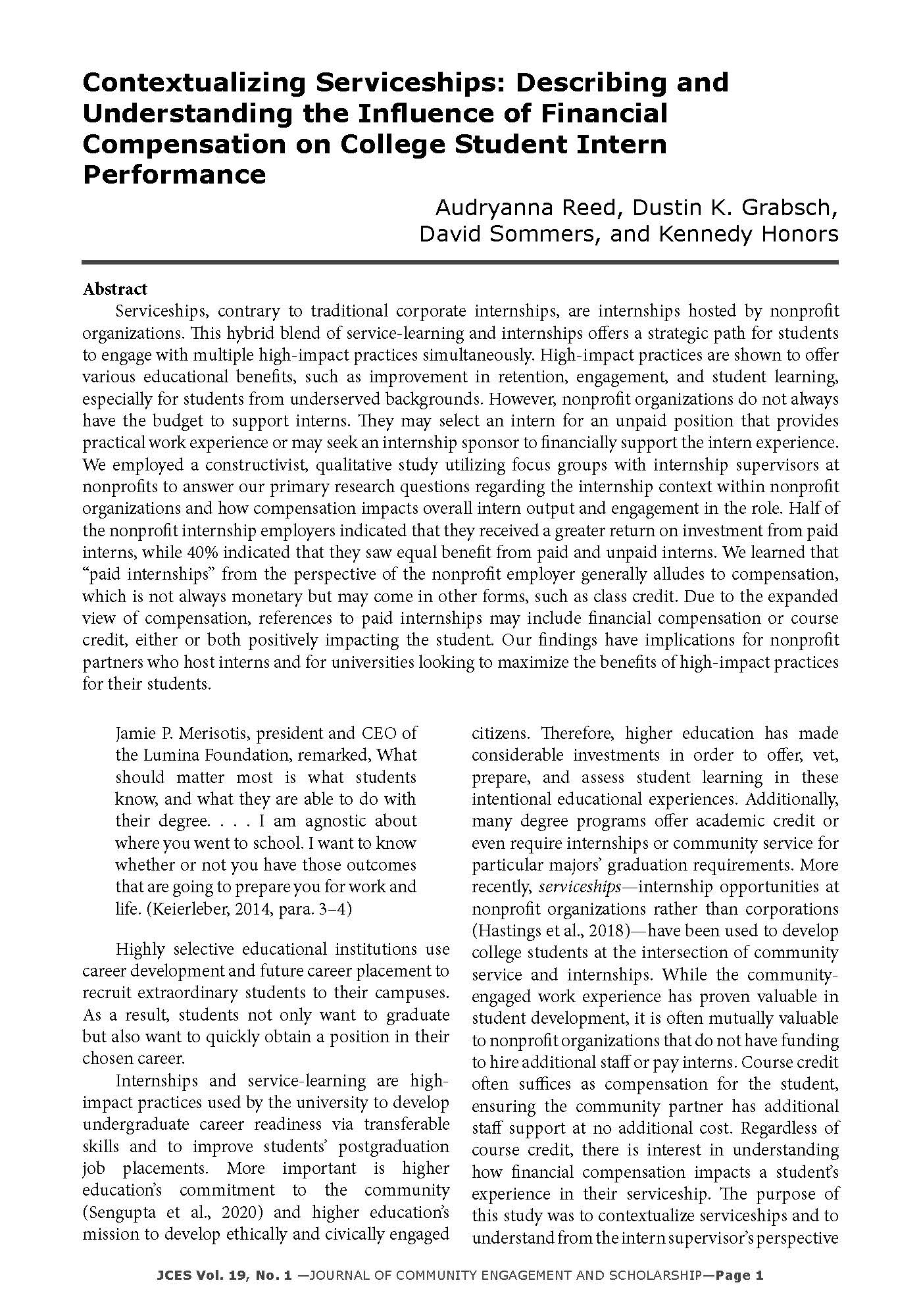 Reed, A., Grabsch, D. K., Sommers, D. & Honors, K. (2026). Contextualizing serviceships: Describing and understanding the influence of financial compensation on college student intern performance. Journal of Community Engagement and Scholarship, 19(1), 1-18. doi: 10.54656/z9ahnw76