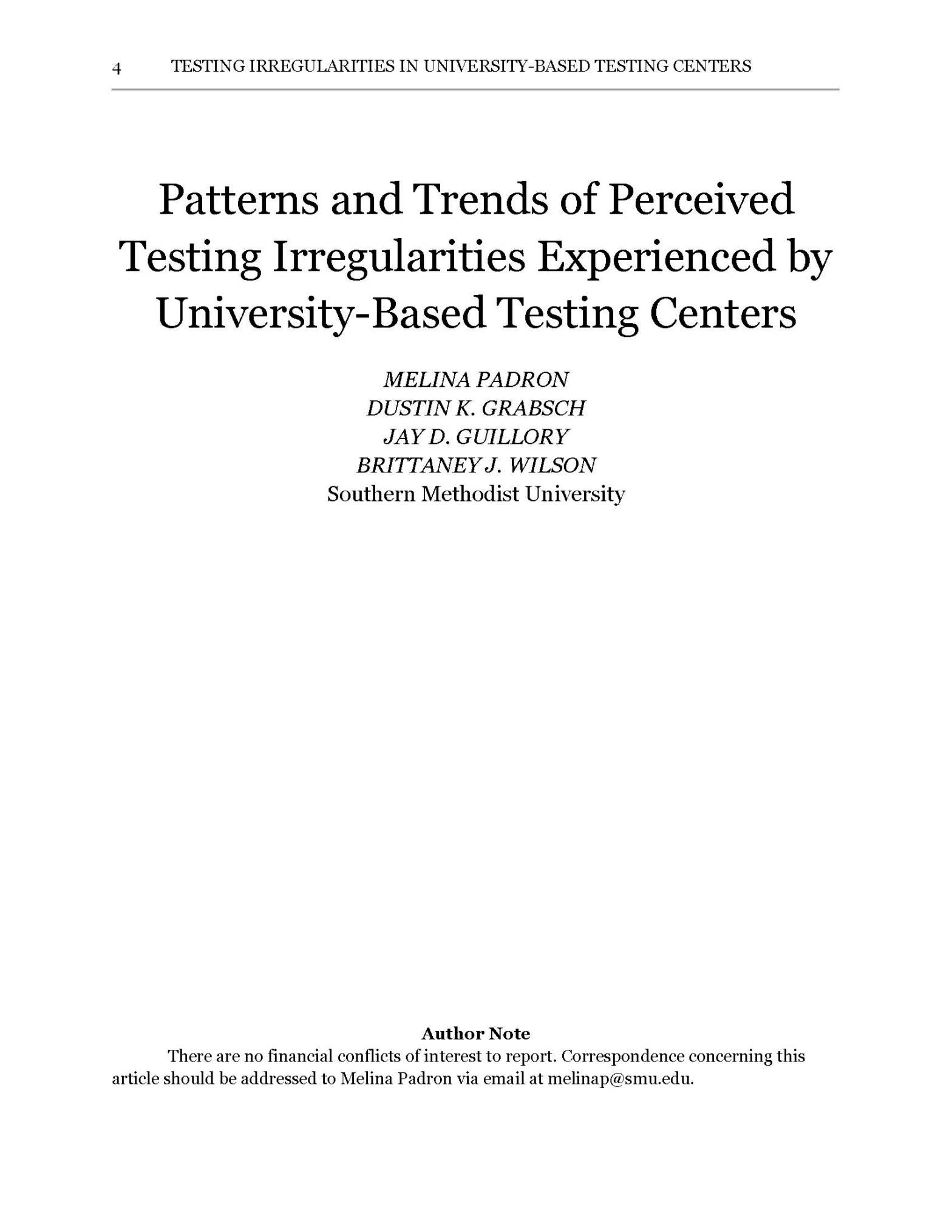 Padron, M., Grabsch, D. K., Guillory, J. D., & Wilson, B. J. (2026). Patterns and trends of testing irregularities experienced by university-based testing centers. National College Testing Association Journal, 7(1), 4-27.
